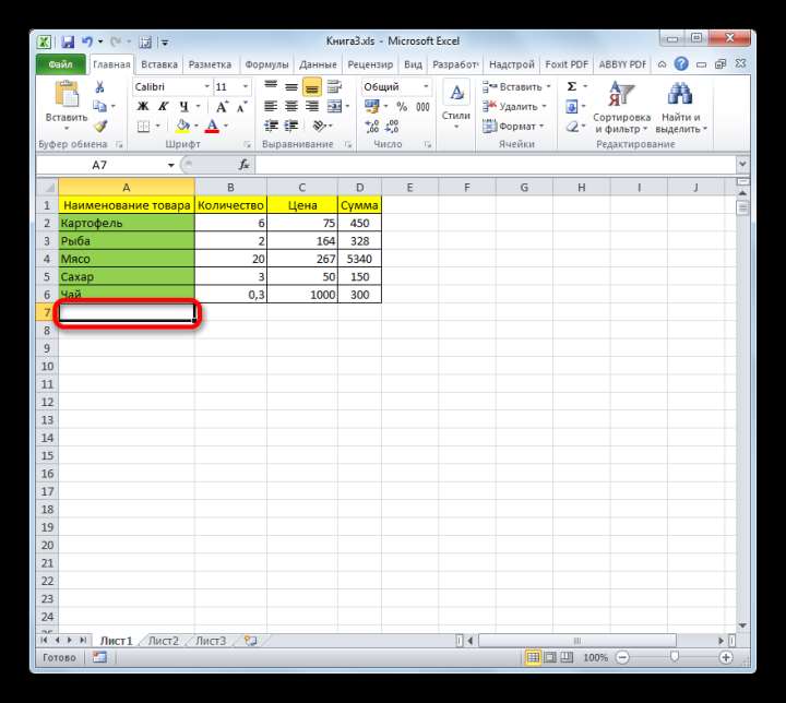 - Теперь посмотрим, как это нам помогло. Выделяем любую ячейку таблицы и набираем сочетание клавиш Ctrl+End. Как видим, Excel выделил последнюю ячейку таблицы, а это значит, что именно она теперь является последним элементом рабочей области листа.