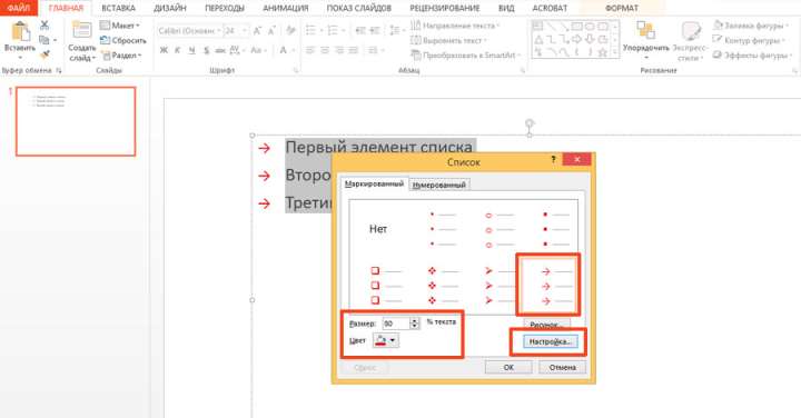 Нажатие на треугольник справа от кнопки «маркеры» откроет список доступных стилей маркеров. Возможно для вашей презентации больше подойдут не «официальные» черные точки-кругляшки, а маркеры-звездочки или маркеры-квадраты? Нет проблем!