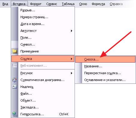 В Word в 2003 сноски делается немного по-другому. Для этого нужно установить курсор в месте, на которое должна ссылаться сноска, открыть меню «Вид — Ссылка» и выбрать там пункт «Сноска».